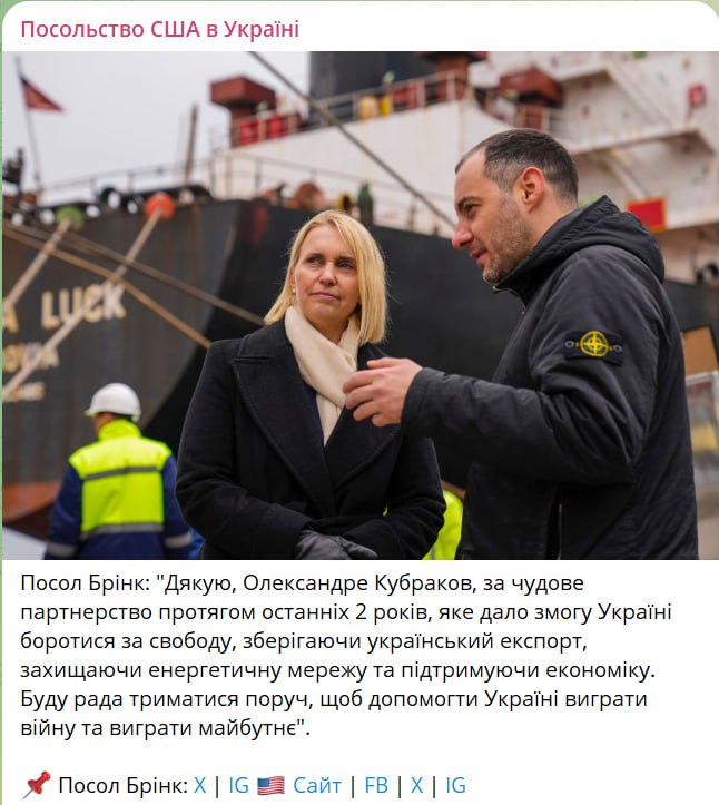 «Дякую, Олександре Кубракову, за відмінне партнерство за останні 2 роки, яке дало можливість Україні боротися за свободу, зберігаючи український експорт, захищаючи енергетичну мережу та підтримуючи економіку. Рада триматися поруч, щоб допомогти Україні виграти війну і виграти майбутнє», – заявила Брінк.
