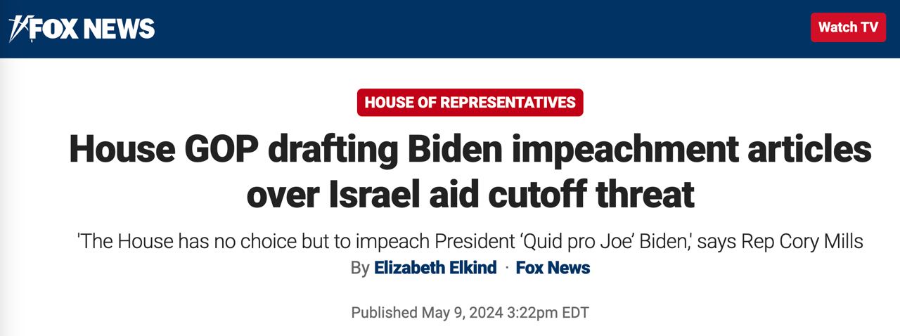 Fox News повідомляє, що Республіканська партія у Палаті представників готується розпочати процедуру імпічменту президенту Байдену через його загрозу припинити військову допомогу Ізраїлю.