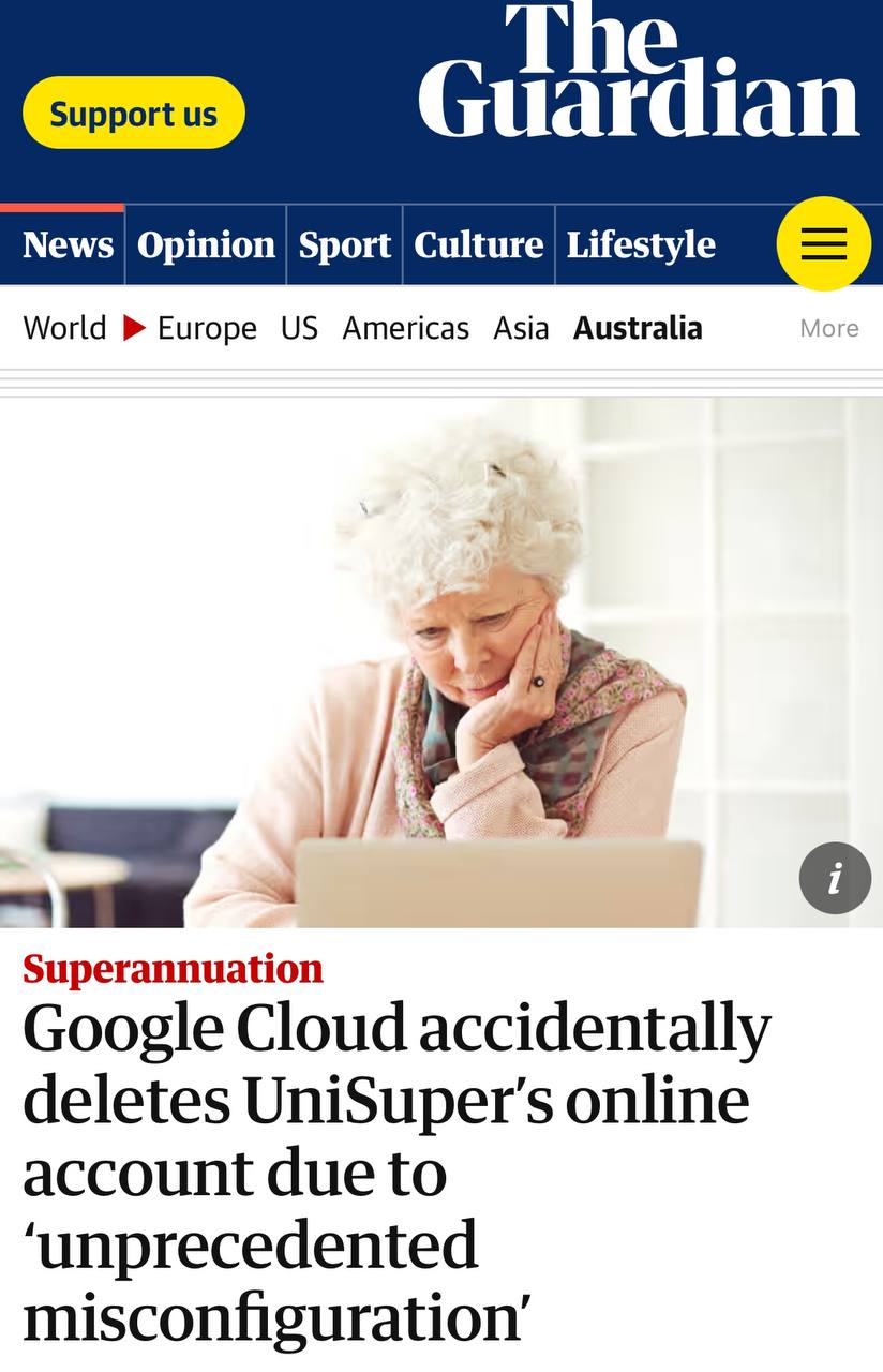 Хмарний сервіс зніс базу даних найбільшого пенсійного фонду Австралії UniSuper. Тисячі людей не могли зайти у свої акаунти тиждень.