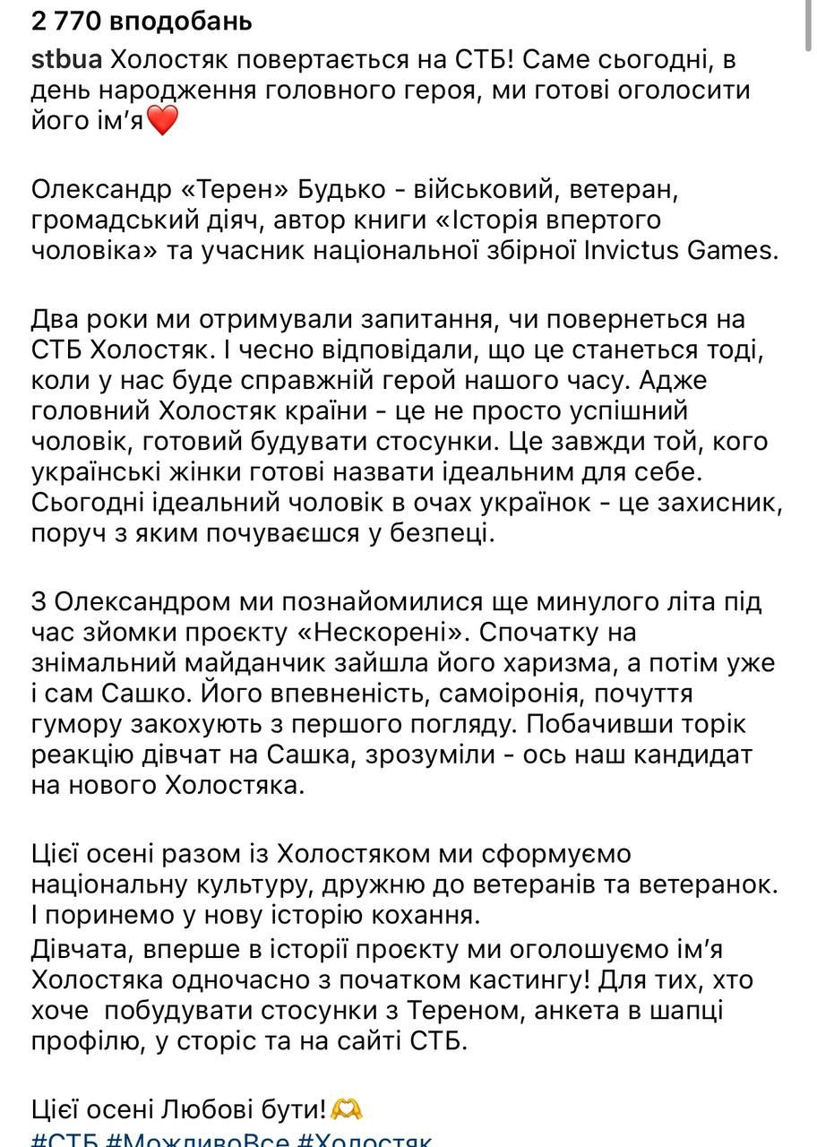 Проект вийде восени, а холостяком стане військовослужбовець ЗСУ Олександр Терен, який втратив на війні обидві ноги.
