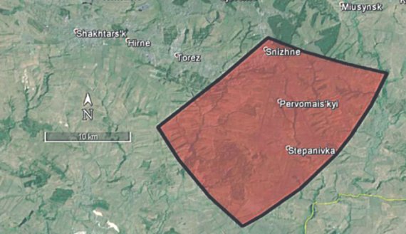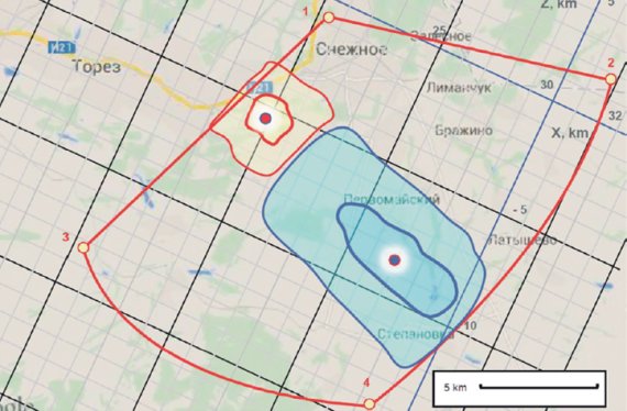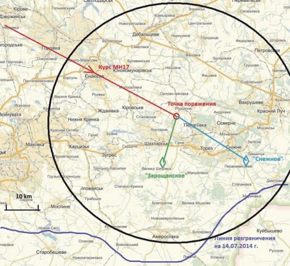 Таким образом была рассчитана зона возможного пуска ракеты, ее площадь получилась равной 320 кв. км (это круг радиусом 10 км или квадрат со сторонами 18 км). С таким большим «пятном» эксперты явно перестраховались, но и в этом варианте все предельно ясно: район южнее населенных пунктов Снежное и Первомайское, т.е. именно там, где по множеству (пока еще не подтвержденных формально) свидетельств находилась пусковая установка российского «Бука».