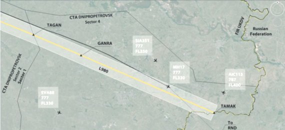 5.2. Во время полета над Донбассом «Боинг», действительно, вышел за пределы «воздушного коридора» трассы L980, но не «на 14 км от левой границы коридора», как вдохновенно врали российские генералы, а лишь с кратковременным и минимальным (судя по карте — не более 3 км) выходом за пределы трассы.