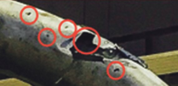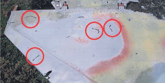 Отмечены и описаны многочисленные пробоины в форме «крыльев бабочки», возникшие после попадания «двутавров» в элементы конструкции самолета.
