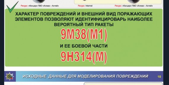 7.2. Определить в рациональных категориях цель и метод второй (от 13 октября) презентации я не берусь. Взаимоисключающие тезисы сыпались один за другим. Главной «вишенкой» на этом торте было заявление (многократно повторенное) о том, что «Боинг» был сбит «без М» (ракета 9М38, а не 9М38М1, головная часть 9Н314, а не 9Н314М). Поражающих элементов в виде «двутавра» не было, а те, что есть, — подброшены неизвестно кем; фотографии пробоин вызывают «большие сомнения в их подлинности». А ракеты «без М» остались только в Украине. Что тут можно возразить? Возразить нечего. Остается только удивляться, что алмаз-антеевцы поленились удалить из Сети свою первую (от 2 июля) презентацию, в которой большими красными буквами написано: