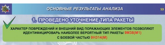 1. Достоверно и однозначно установлена причина крушения самолета. В предыдущем (предварительном) отчете, опубликованном в сентябре 2014 года, эта причина была определена как «поток высокоэнергетических объектов, подошедших к самолету извне». Теперь назван и источник этого «потока» — боевая часть зенитной ракеты комплекса «Бук». Определен тип боевой части (9Н314М), в телах жертв и в элементах конструкции самолета обнаружены по меньшей мере 43 (и еще 29 не удалось идентифицировать однозначно) готовых поражающих элемента (ГПЭ) трех разных типов, используемых в этой боевой части, включая характерные, используемые только в этой БЧ «двутавры».