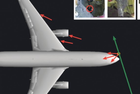 3. С приемлемой точностью была решена и несравненно более сложная задача: определено угловое (по отношению к самолету) положение корпуса ракеты в момент подрыва БЧ. Единственным источником информации в данном случае является распределение пробоин от поражающих элементов на внешней обшивке и внутренних элементах конструкции самолета, что позволяет выстроить пространственную модель потока поражающих элементов; далее, зная скорость сближения ракеты и самолета, скорость и углы разлета ГПЭ, можно определить то положение ракеты в пространстве, которое дает распределение пробоин, совпадающее с реальным.