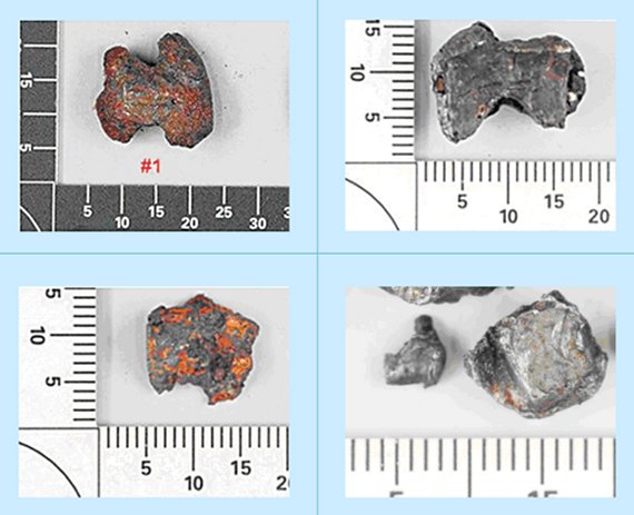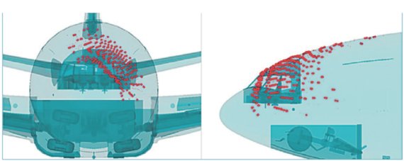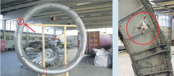 Фактически правый двигатель при подрыве БЧ ракеты задет не был. Повреждения левого двигателя есть (хотя их и несравненно меньше, чем на носовой части фюзеляжа), и — что чрезвычайно важно — все они локализованы только на входном кольцевом обтекателе, а на боковой поверхности мотогондолы вообще нет ни одной пробоины. Такое пространственное распределение повреждений могло возникнуть только в случае соударения с предметами, которые летели навстречу самолету слева от фюзеляжа. Что это за предметы? Вот они (фотография любезно предоставлена «Алмаз-Антеем»):