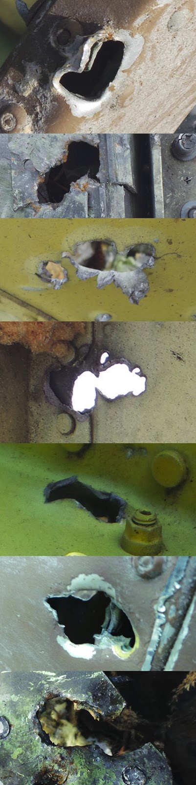 Многочисленные пробоины в форме «крыльев бабочки», возникшие после попадания «двутавров» в элементы конструкции самолета