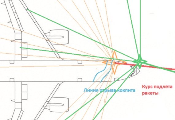 Если забыть на минуту, что мы обсуждаем обстоятельства убийства трех сотен людей, то можно сказать, что «в этой картинке прекрасно все». В нарушение элементарных правил сложения векторов (учебник физики, 6-й класс средней школы) поражающие элементы разлетаются перпендикулярно корпусу ракеты, несущейся со скоростью 730 м/сек. Совершенно непонятно: что же при такой геометрии встречи смогло попасть в левый двигатель (и это притом что авторы доклада сами же обозначили этот двигатель как зону повреждений средней и высокой степени)? Схема разрушения носовой части фюзеляжа заведомо неверна — в реальности кабина пилотов была отрублена примерно в 2 метрах за остеклением: