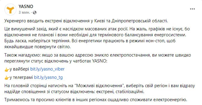 Унаслідок зростання дефіциту в енергосистемі, НЕК «Укренерго» дала вказівку про введення графіків аварійних вимкнень. Графіки вводяться в обсязі першої та другої черги.