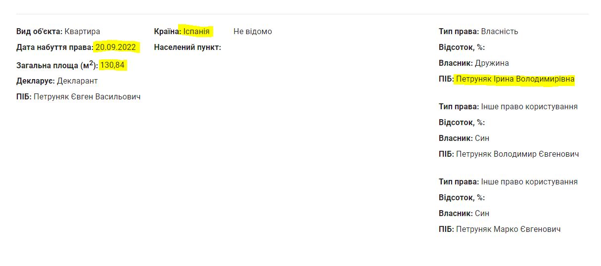 І тут я пригадав, що десь читав новину про те, що дружина народного депутата Євгена Петруняка, придбала в вересні 2022 року квартиру в Іспанії площею 130 метрів.