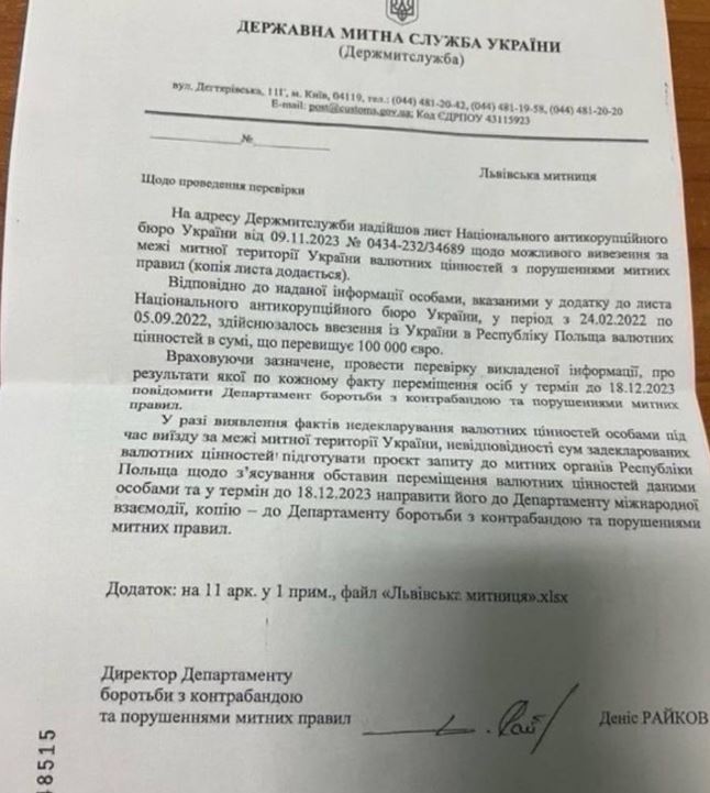 Згідно із цим листом, 23.08.2022 людина з таким ім’ям вивезла з України 305 000 доларів готівкою через п/п «Шегині».