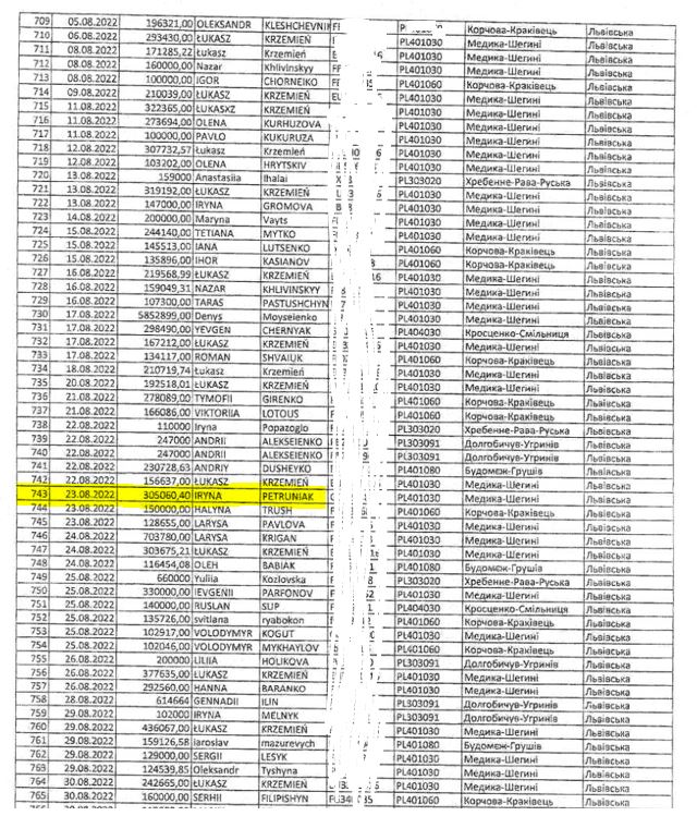 Але за дивним збігом обставин, в переліку перевізників кешу від НАБУ, який вони отримали від митниці, під номером 743 значиться Ірина Петруняк.