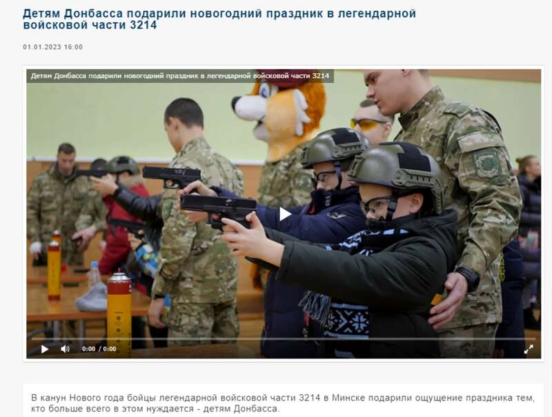 В іншому медіазвіті бачимо, як у грудні 2022 року територією все того ж спецпризначенського ВПК “Рись” іде група дітей з тимчасово окупованої Горлівки. Підлітків та молодших школярів зустрічають військові, перевдягнені в іграшкових рисей.