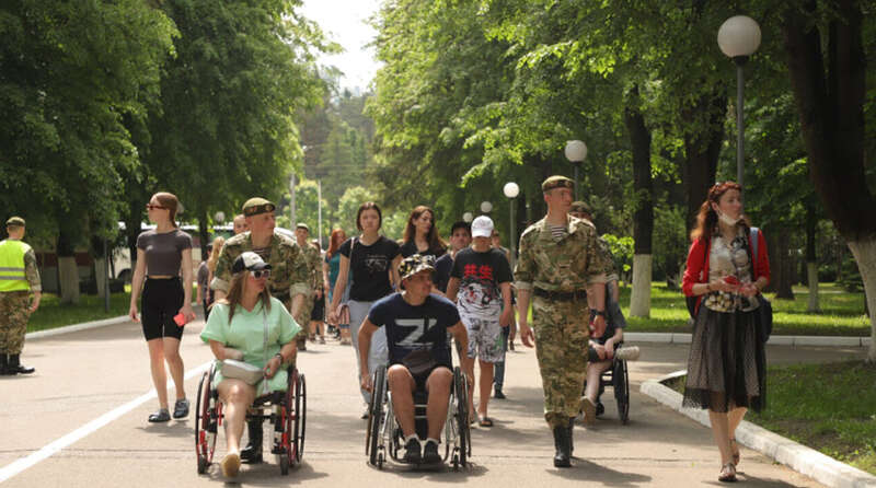 Так, у червні 2022 року бачимо репортаж державного агентства Белта про одну із таких екскурсій. Діти з інвалідністю, яких до військової частини привезла директорка донецької громадської організації “Дельфіни” Ольга Волкова, у супроводі військових ідуть територією частини, деякі діти на кріслах колісних. Один з візків, у якому сидить дівчина з ампутацією ноги, котить військовий.
