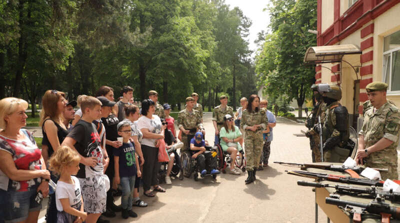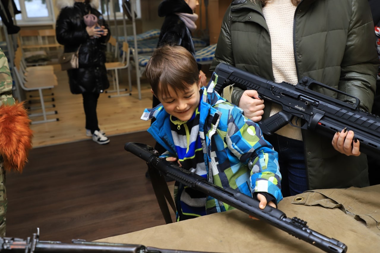 Дітям розповідають про бойові завдання та проводять екскурсію частиною, демонструють зброю й навіть дають її потримати. На опублікованому фото хлопчик років дев’яти намагається втримати в руках великий автомат.