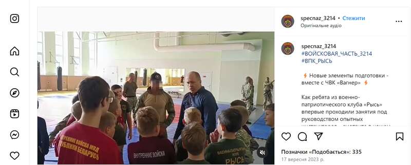 Так, наприклад, на інстаграм-сторінці військово-патріотичного клубу “Рись” з’явився звіт про те, що інструктори ПВК “Вагнер” провели тренування вихованців та поговорили з ними про патріотизм.
