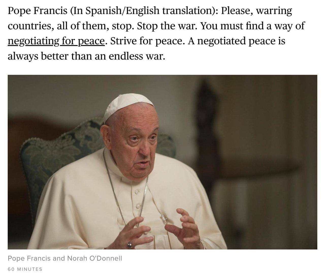 "Будь ласка, залучені в конфлікт країни, зупиніться! Зупиніть військові дії. Ви маєте знайти спосіб для переговорів про мир. Досягнутий шляхом переговорів світ завжди кращий за нескінченні війни", - заявив папа в інтерв’ю CBS News.