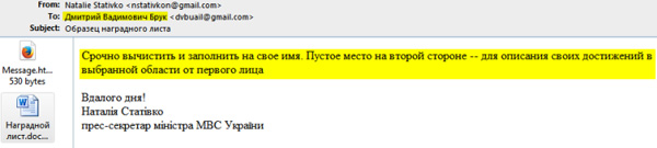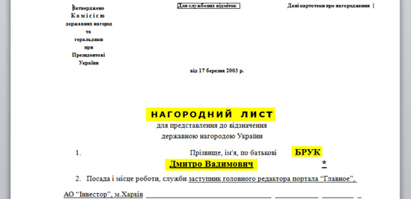 Как пишут хакеры, награда была получена по блату. Но лично я не обнаружила вообще никаких денежных наград или знаков отличия, которые были вручены Бруку в день журналиста 2015 года. Правда, ему вручили в НСЖУ похвальную грамоту за работу в зоне АТО, как, впрчем, и другим журналистам-волонтерам из Харькова.