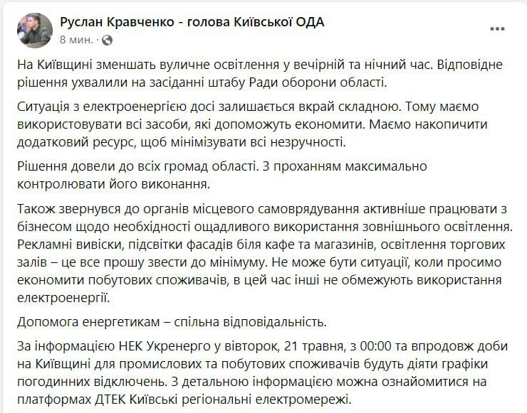 На Київщині зменшать вуличне освітлення у вечірній та нічний час. Відповідне рішення ухвалили на засіданні штабу Ради оборони області, повідомив голова Київської ОВР Руслан Кравченко.