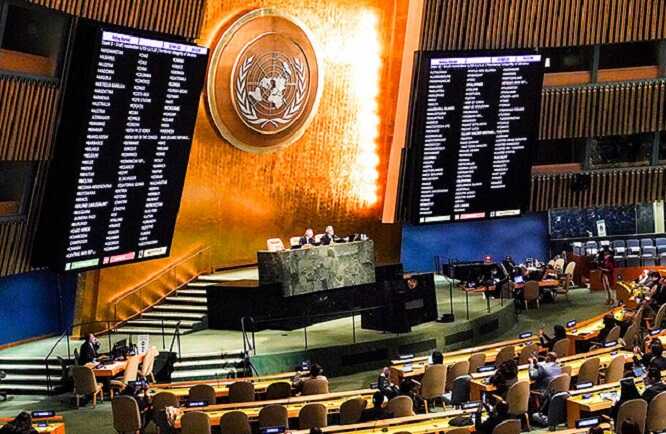 Як і завжди, російський "дипломат" перекрутив факти. За "блоковою дисципліною" голосує якраз та меншість, яка була проти резолюції. Це Росія, Угорщина, Білорусь, Китай, Сирія, Куба, КНДР, Еритрея, Есватіні, Малі, Науру, Нікарагуа та Сербія.
