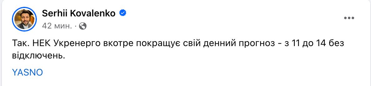 Про це повідомляє гендиректор Yasno Сергій Коваленко.