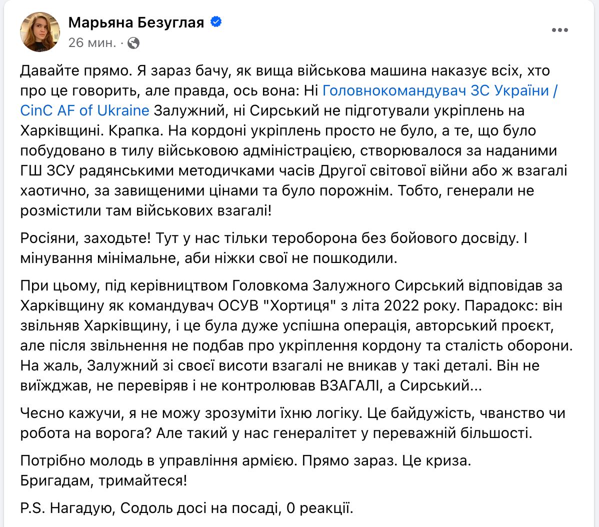 "Ані головком Залужний, ані Сирський не підготували укріплень на Харківщині. На кордоні укріплень просто не було, а те, що було збудовано у тилу військовою адміністрацією, створювалося за наданими ГШ ЗСУ радянськими методиками часів Другої світової війни або взагалі хаотично, за завищеними цінами і було тобто генерали не розмістили там військових взагалі!" - пише Безугла.