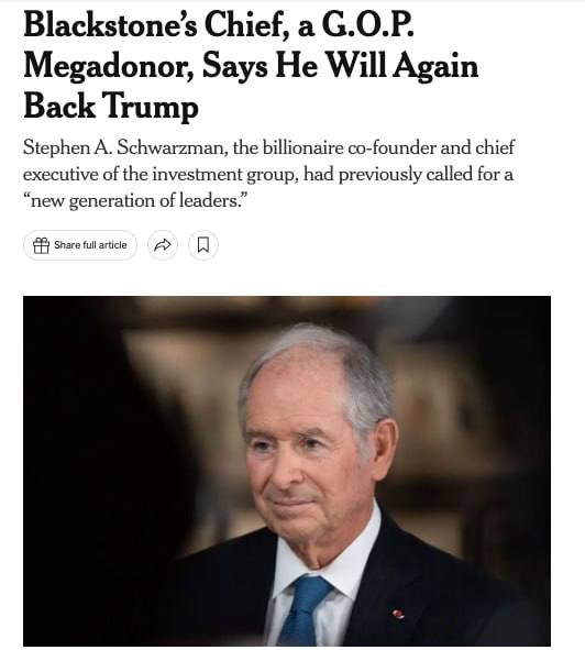 Глава інвестфонду Blackstone Стівен А. Шварцман, найбільшого власника комерційної нерухомості у світі, підтримав кандидатуру Дональда Трампа як «голос за зміни».