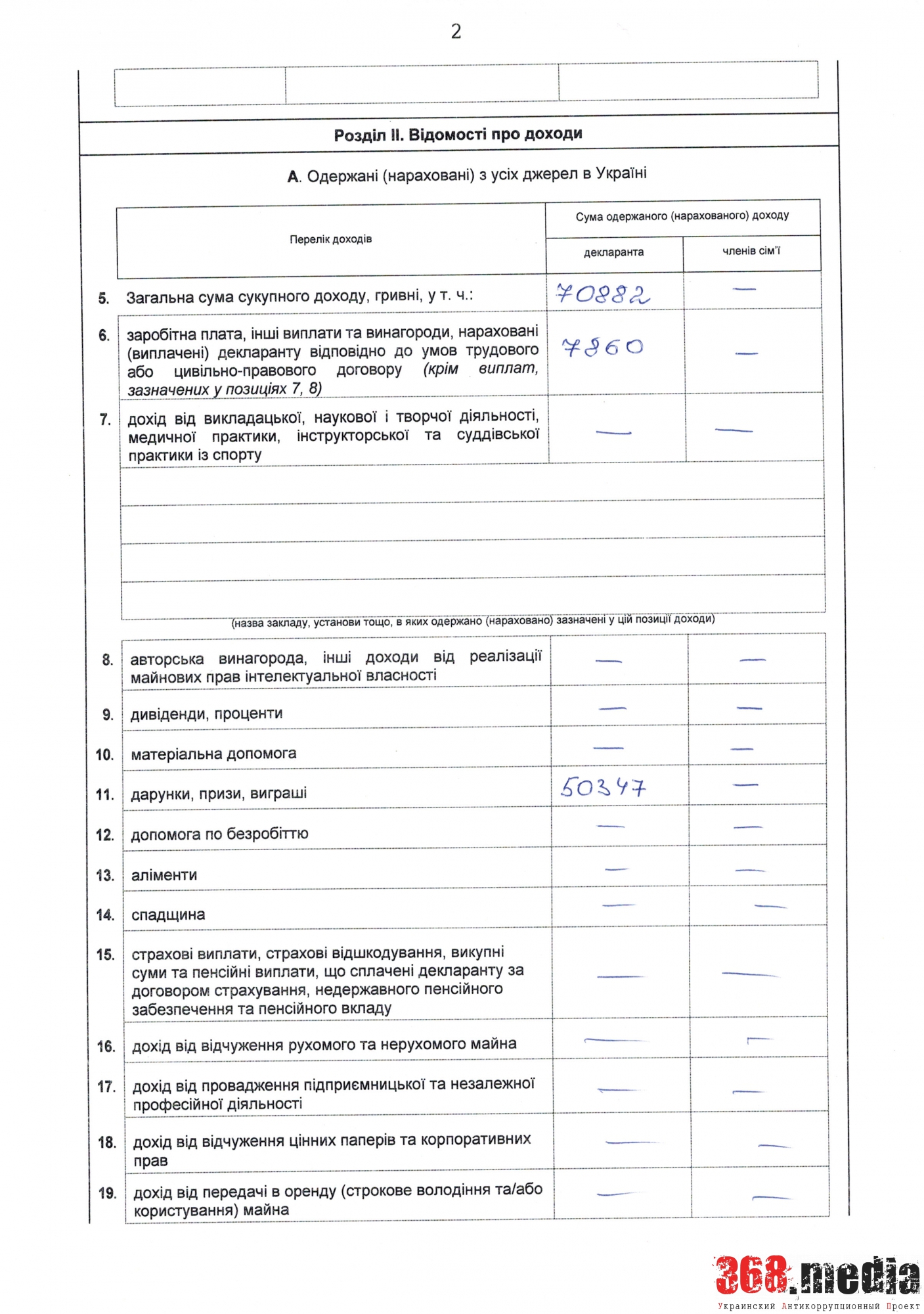 В прошлом году, 30-летний депутат горсовета, занимая должность юриста общественной организации «Украинская национальна федерация таиландского бокса Муэй-тай» заработала всего менее восьми тысячи гривен. Еще 50 тыс. гривен она получила в качестве выиграшей/призов/подарков, а остальные деньги от других видов доходов.