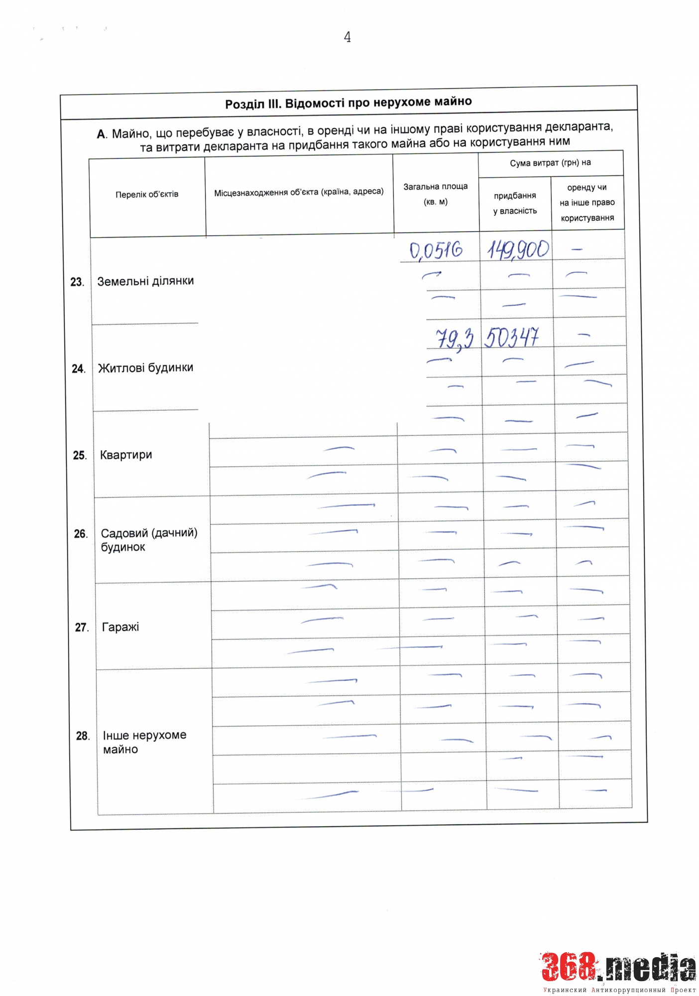 Есенович прикупила себе участок в 516 кв. метров за 150 тысяч гривен, а также квартиру (79,3 кв. метра) всего лишь за 50 тыс. гривен. Более никакого имущества, равно как и доходов у нее нет.
