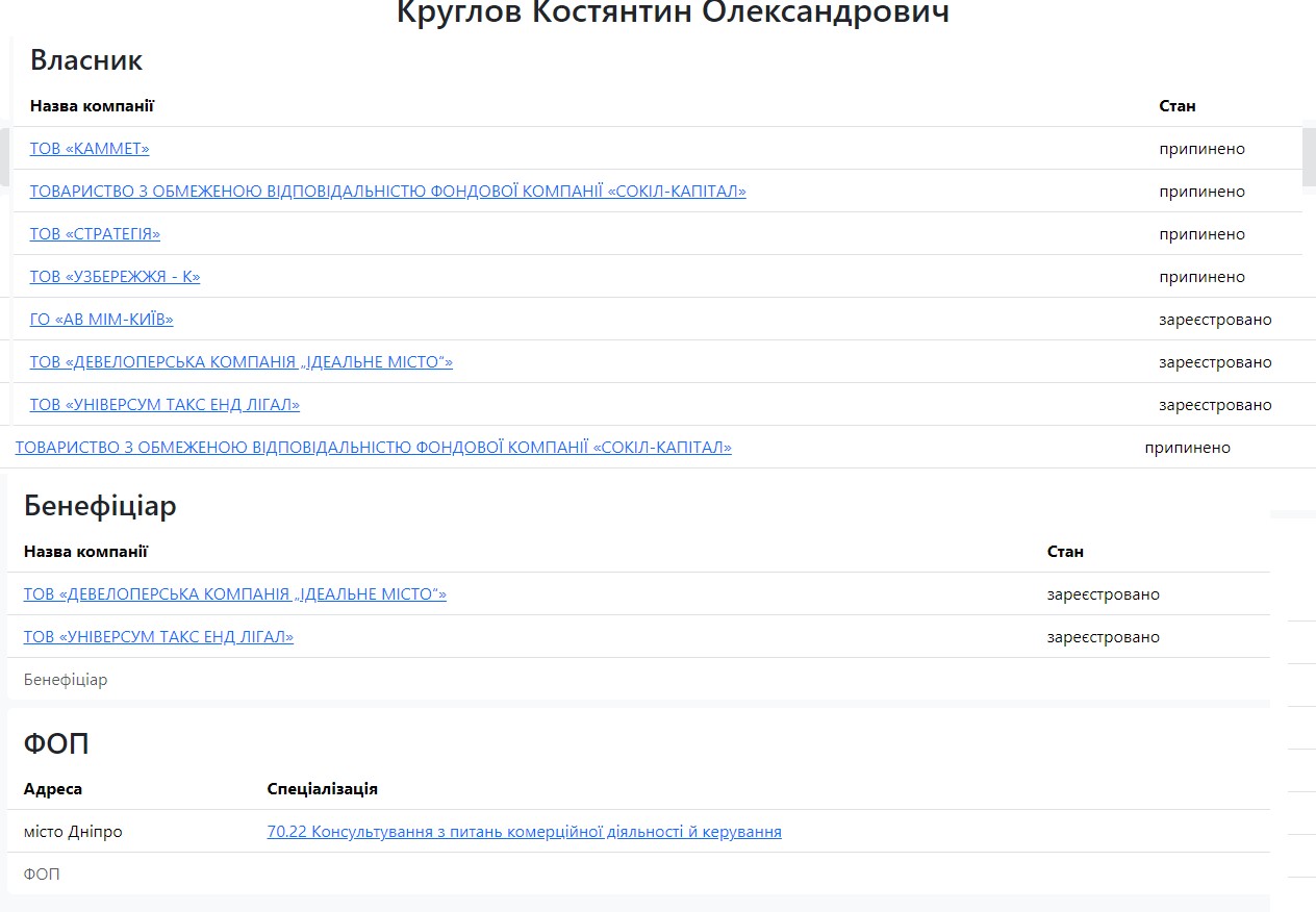 Чи використовує Костянтин Круглов у цих цілях ті фірми, які оформлені на нього самого, – питання дискусійне. Але в даних умовах можна припустити, що дійшла черга і до них. Тим більше, що їх перелік дуже солідний, і багато фірм із цього переліку фігурують у кримінальних справах саме економічного характеру.