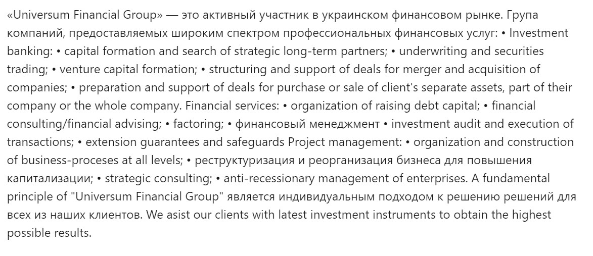 Але «юридичного холдингу Universum» у реєстрах не існує, проте існує ТОВ «Універсум такс енд лігал». І як для «холдингу» результати дуже плачевні. Як в економічному, так і в юридичному сенсі. Ось фінансові результати. Особливо вони вражають на тлі активів. Холдинг з одним працівником та трьома тисячами гривень прибутку на рік – це справді «активна участь у фондовому ринку». Не посперечаєшся.