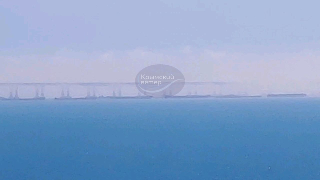 "Уздовж Керченського мосту продовжують встановлювати бонові загородження з барж, яких уже десять. Позавчора їх було дев’ять", – йдеться у повідомленні.