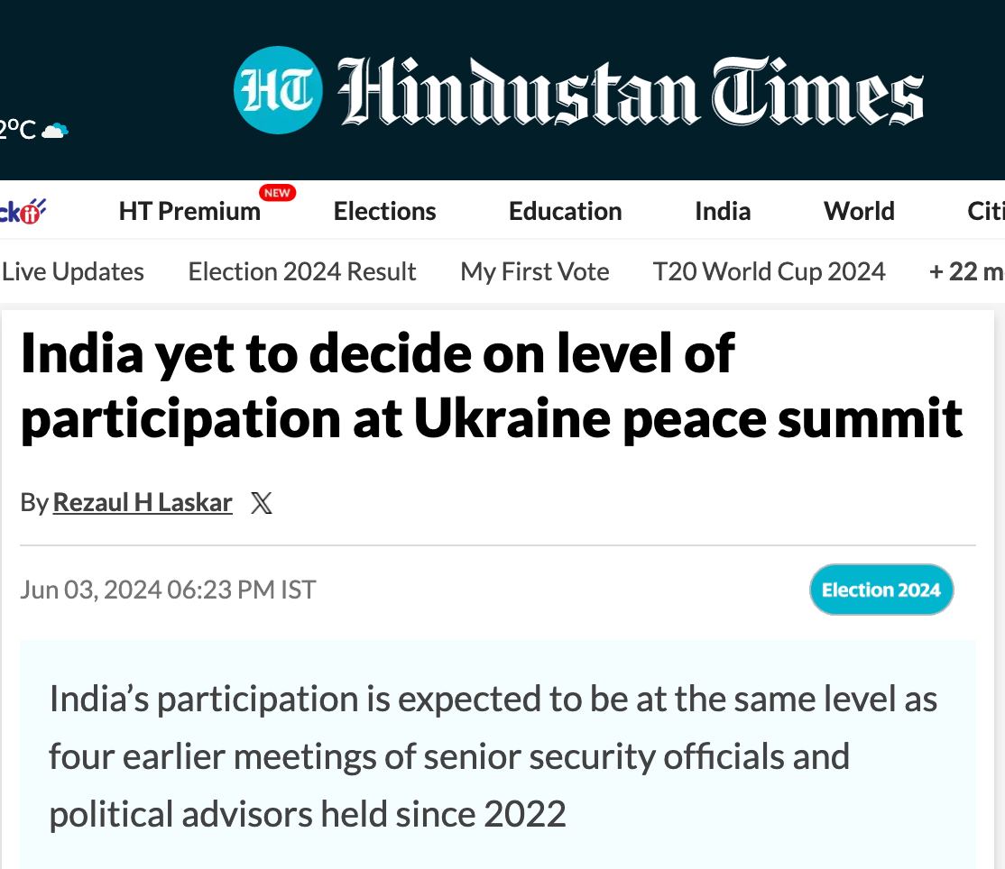 Hindustan Times із посиланням на джерела повідомляє, що Індія не буде представлена на мирному саміті у Швейцарії на найвищому рівні.