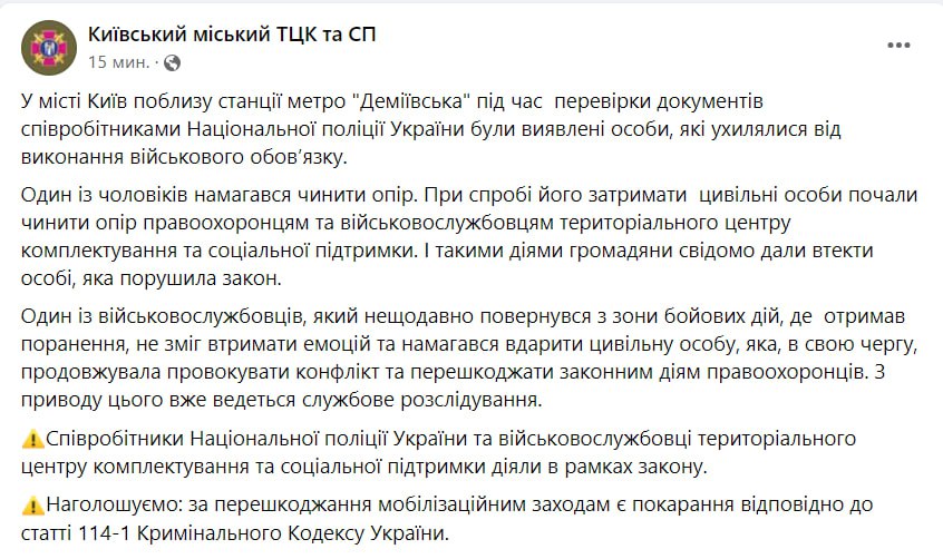 У повідомленні ТЦК у Фейсбуці йдеться, що біля станції метро «Деміївська» під час перевірки документів співробітники поліції виявили «ухиляються від виконання військового обов’язку осіб».