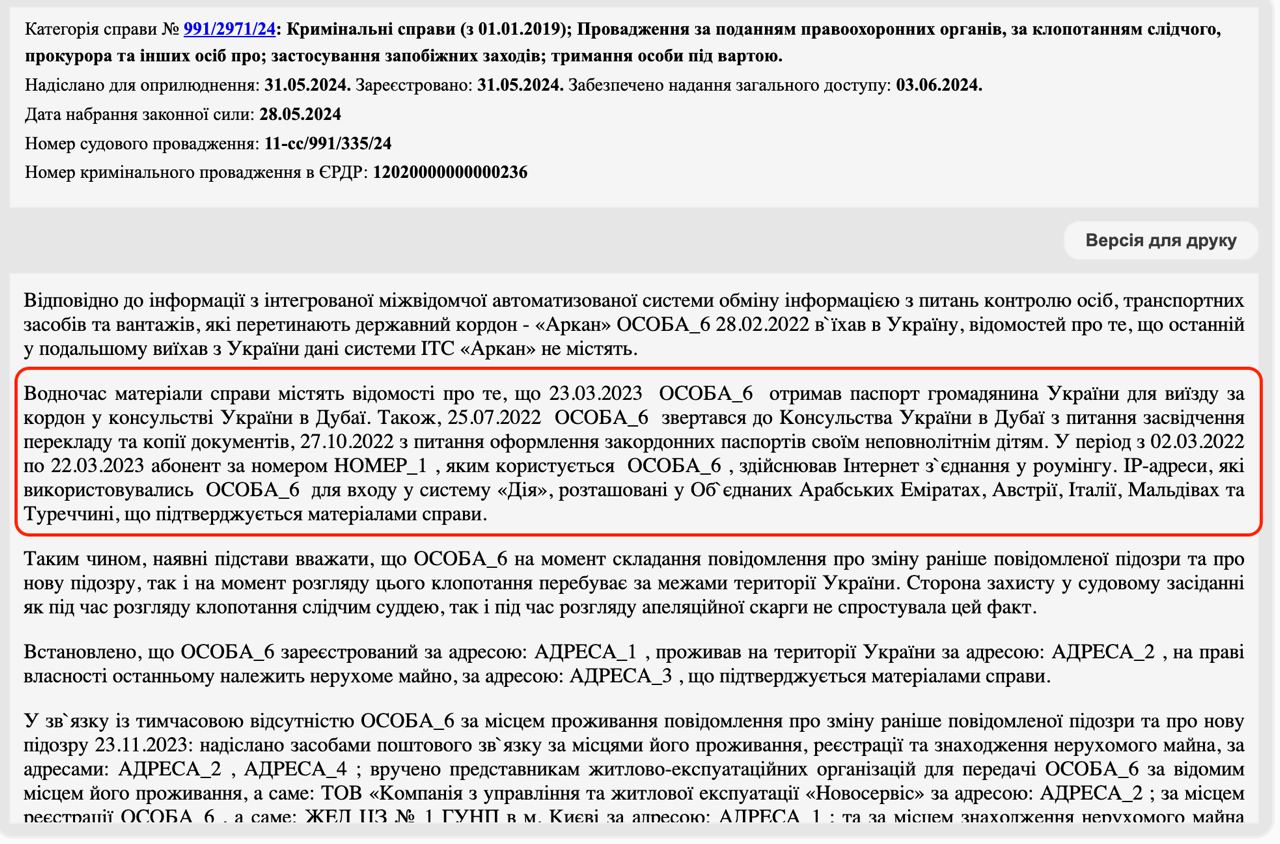 "IP-адреси, які використовували Особа_6 (імовірно, Андрій Гмирін - Ред.) для входу в систему "Дію", розташовані в Об’єднаних Арабських Еміратах, Австрії, Італії, Мальдівах та Туреччині, що підтверджується матеріалами справи", - йдеться у рішенні суду .