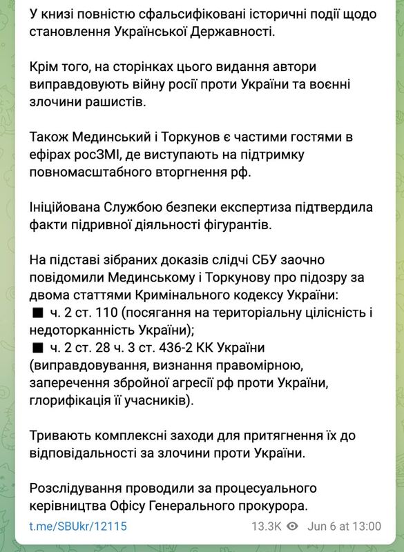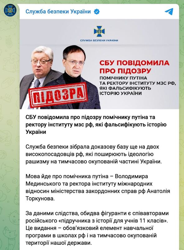 СБУ повідомила про підозру колишньому першому помічнику президента Росії Володимиру Мединському та ректору інституту Міністерства закордонних справ РФ Анатолію Торкунову. Чиновників звинувачують у фальсифікуванні історії України.