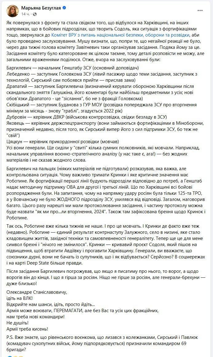Про це заявила заступниця голови Комітету Ради з оборони та нацбезпеки, нардеп від «Слуги народу» Мар’яна Безугла, коментуючи засідання Комітету, де було присутнє командування ЗСУ – голова Генштабу Баргілевич, його заступник Драпатий, заступник голови ГУР Скібіцький, заступник Сирского Лебеденко та інші вищі офіцери.
