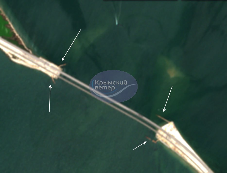 "Бонові загородження почали будувати і в південно-східній частині Керченського мосту. Біля опор мосту в одному з прольотів помічено роботу двох кранів, встановлених на баржах, які монтують загородження. Також на знімку видно дві затоплені баржі неподалік опори", – йдеться у повідомленні.