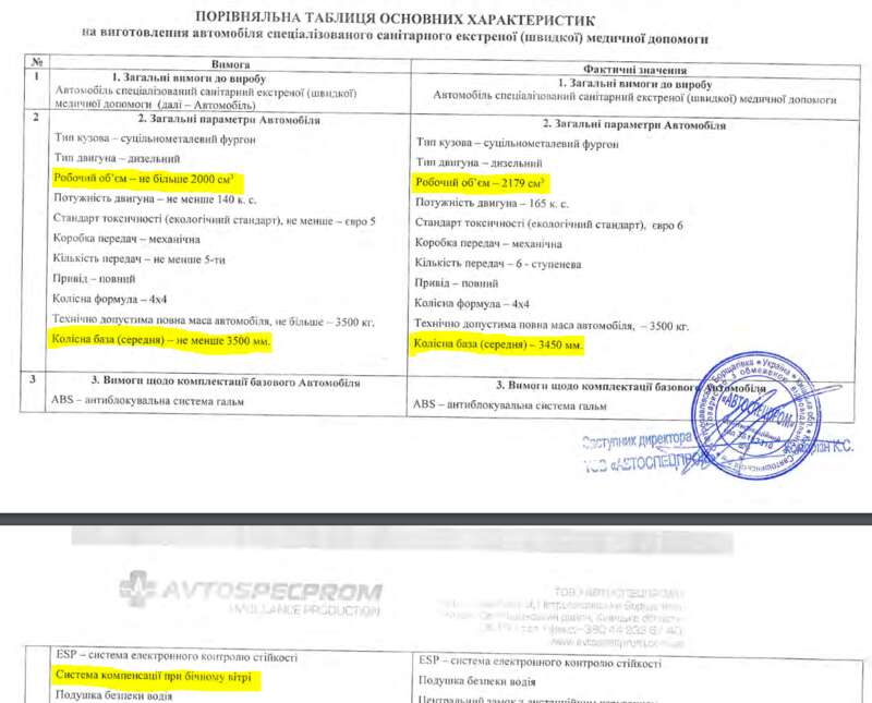 Наприклад, вимагались робочий об’єм двигуна не більше 2 000 куб. см і середня колісна база не менше 3 500 мм. Натомість «Автоспецпром» вказав у порівняльній таблиці більший робочий об’єм двигуна 2 179 куб. см і меншу середню колісну базу 3 450 мм. Крім того, в «Автоспецпрому» не зазначена система компенсації при бічному вітрі, а дефібрилятор має ступінь захисту від рідини і твердих предметів ІР 54 замість не гірше ІР 55.
