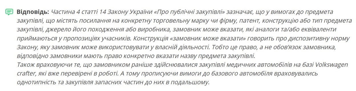 Замовник відмовився змінювати свої вимоги. Він нагадав, що при проведенні спрощеної закупівлі може, але не зобов’язаний вказувати біля посилання на конкретну торговельну марку чи фірму, патент, конструкцію або тип предмета закупівлі, джерело його походження або виробника, які аналоги й еквіваленти приймаються у пропозиціях учасників. Також він написав, що вже купував медичні автомобілі на базі Volkswagen Crafter, які перевірені в роботі, тому при прописуванні вимог до шасі враховувались однотипність і закупівля запасних частин.