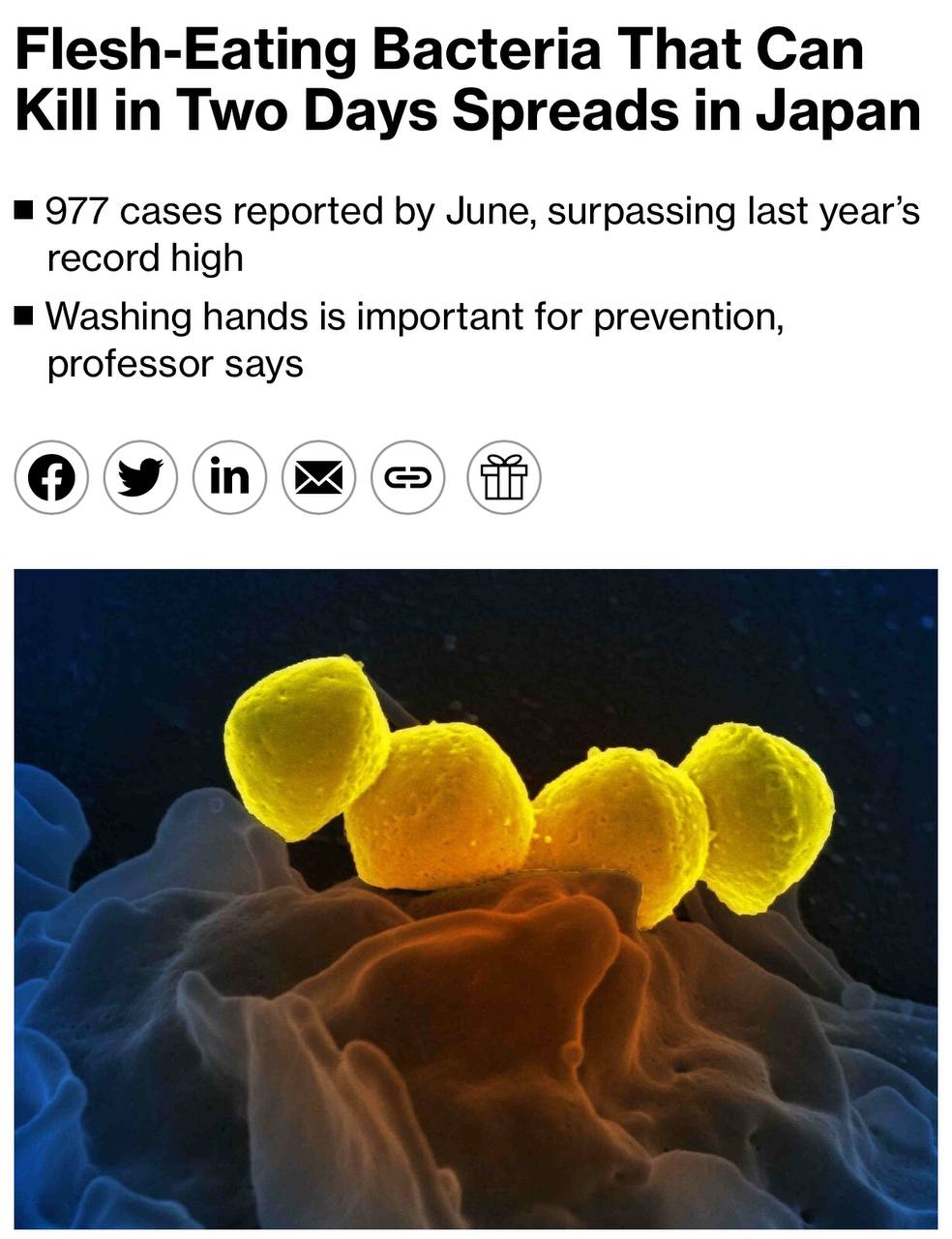 В Японії поширюється захворювання, спричинене рідкісною "м’ясоїдною бактерією", яка може вбити людину протягом 48 годин.