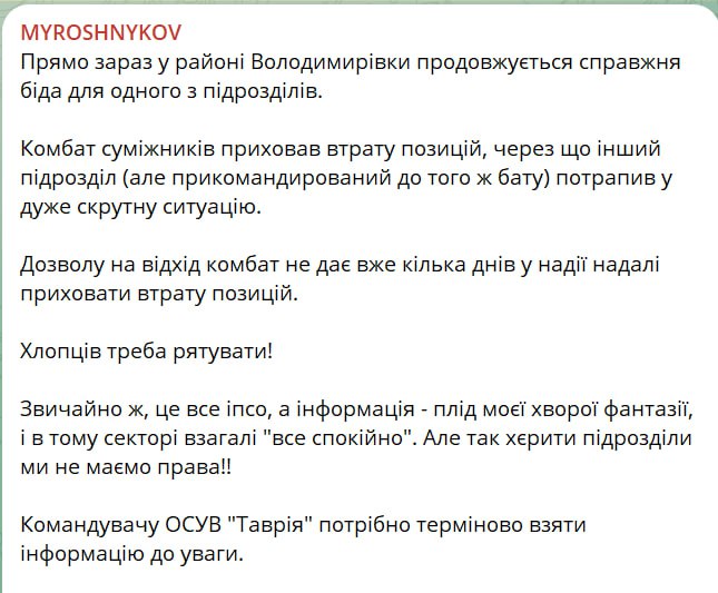 «Прямо зараз у районі Володимирівки триває лихо для одного з підрозділів. Комбат суміжників приховав втрату позицій, через що інший підрозділ (але прикомандований до того ж бату) потрапив у скрутну ситуацію. Дозволи на відхід комбат не дає вже кілька днів, сподіваючись надалі приховати втрату позицій. Хлопців треба рятувати», – написав він.