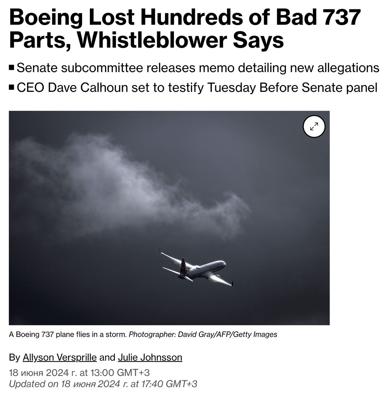 За його словами, у Boeing "втратили" до 400 неякісних деталей. Вони могли бути встановлені на нових літаках. Це пошкоджені або невідповідні якості компоненти, які слід відстежувати, утилізувати чи ремонтувати, ведучи ретельний облік.