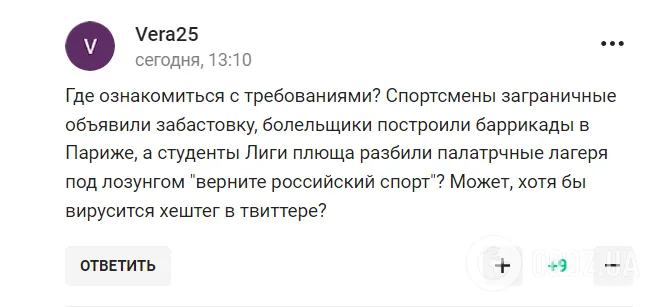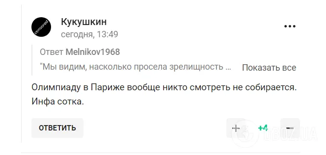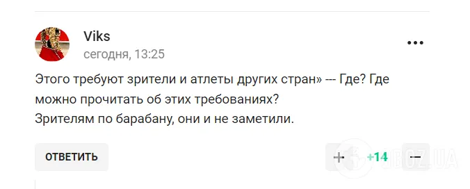 "Міш, ти зовсім чи що? Табличку бачив?" ,"Цього вимагають глядачі та атлети інших країн" --- Де? Де можна прочитати про ці вимоги? Глядачам по барабану, вони і не помітили", "Олімпіаду в Парижі взагалі ніхто дивитися не збирається. Інфа сотка", "На колінах приповзуть , Так ", "Прямо вимагають і ніжками тупотять, повернути негайно спортсменів, ух", - стібуться користувачі.