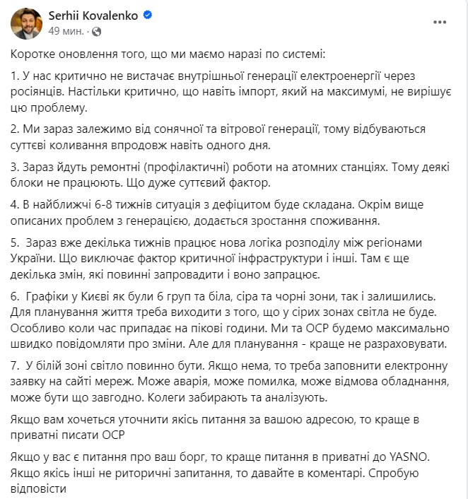 Таку думку висловив генеральний директор енергетичної компанії Yasno Сергій Коваленко у Facebook.