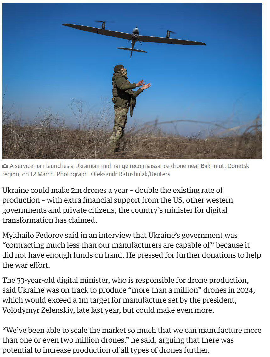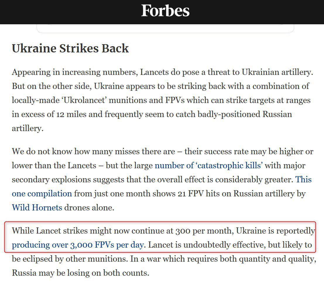 При цьому Forbes, говорячи про виробництво 3000 FPV-дронів на день, посилається на статтю The Guardian тримісячної давності, де наводяться розрахунки глави Мінцифри Федорова.