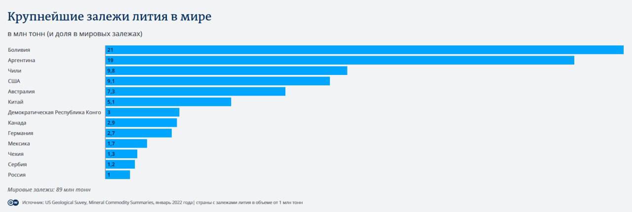 DW зазначає, що, співпрацюючи з компаніями РФ з видобутку та переробки літію, уряд Болівії одночасно відмовив у цьому компаніям із Німеччини.