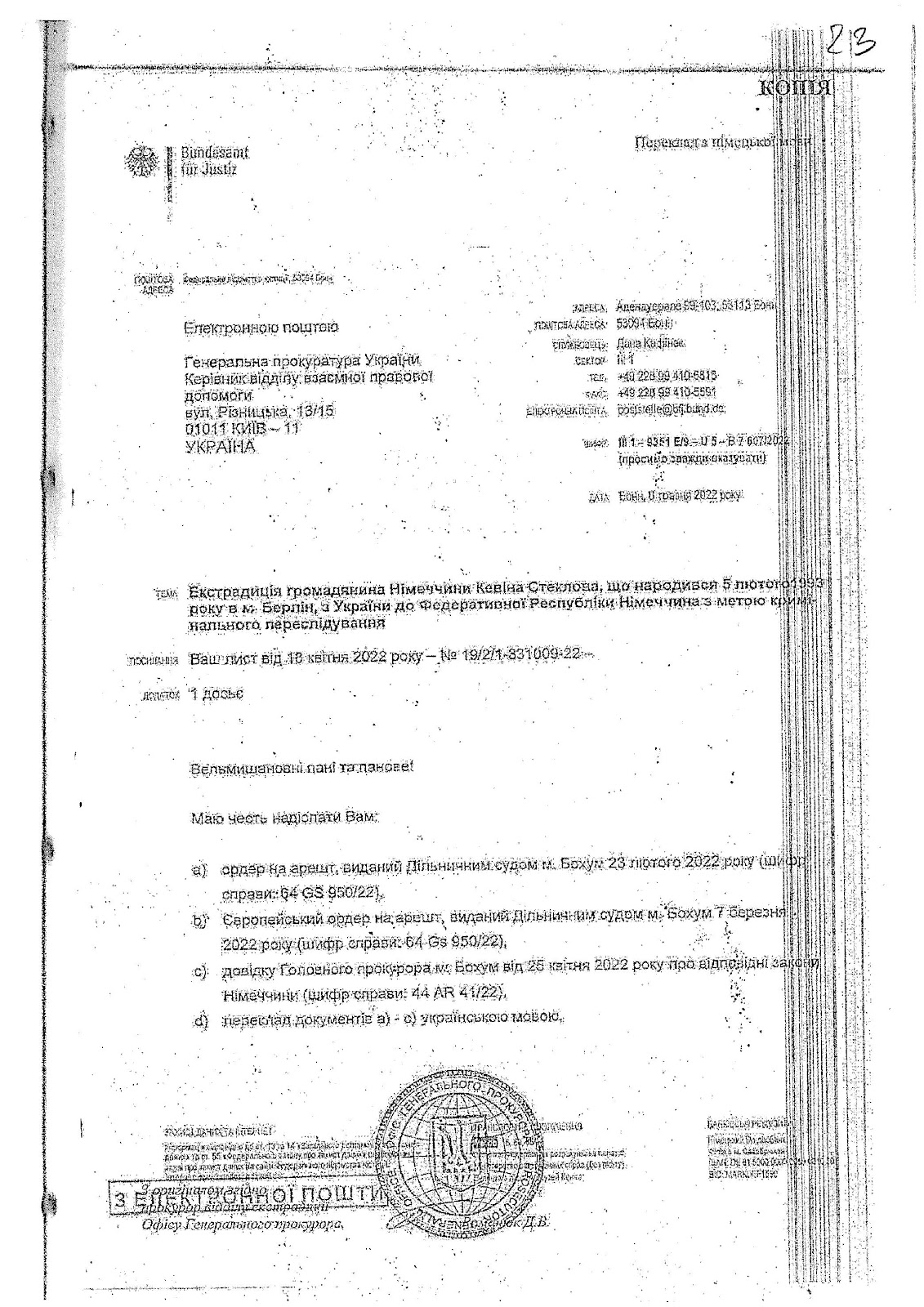 Ось ордер на арешт Кевіна Стеклова, виданий судом першої інстанції Бохума 23 лютого 2022 року.