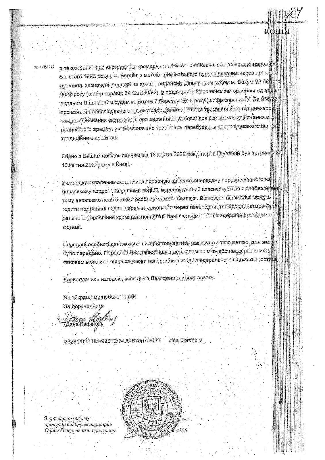 А ось лист Нацполіції України в ОГПУ, який недвозначно підтверджує той факт, що поліція в курсі, що Кевін Стеклов розшукується Інтерполом. Датовано цей документ ще 11 квітня 2022 року.